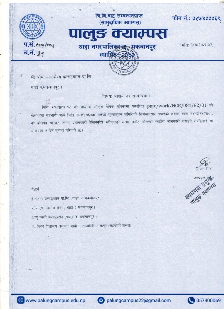 पालुङ बहुमुखी क्याम्पसलाई शैक्षिक गुणस्तरीयता, आत्मनिर्भरता, सामाजिक जिम्मेदारिता, साँस्कृतिक समानताले भरिपूर्ण, राष्ट्रिय अन्तरराष्ट्रिय मागस्तरको शिक्षा प्रदान गर्ने शैक्षिक धरोहरका रुपमा विकास गर्ने...